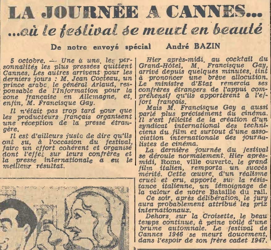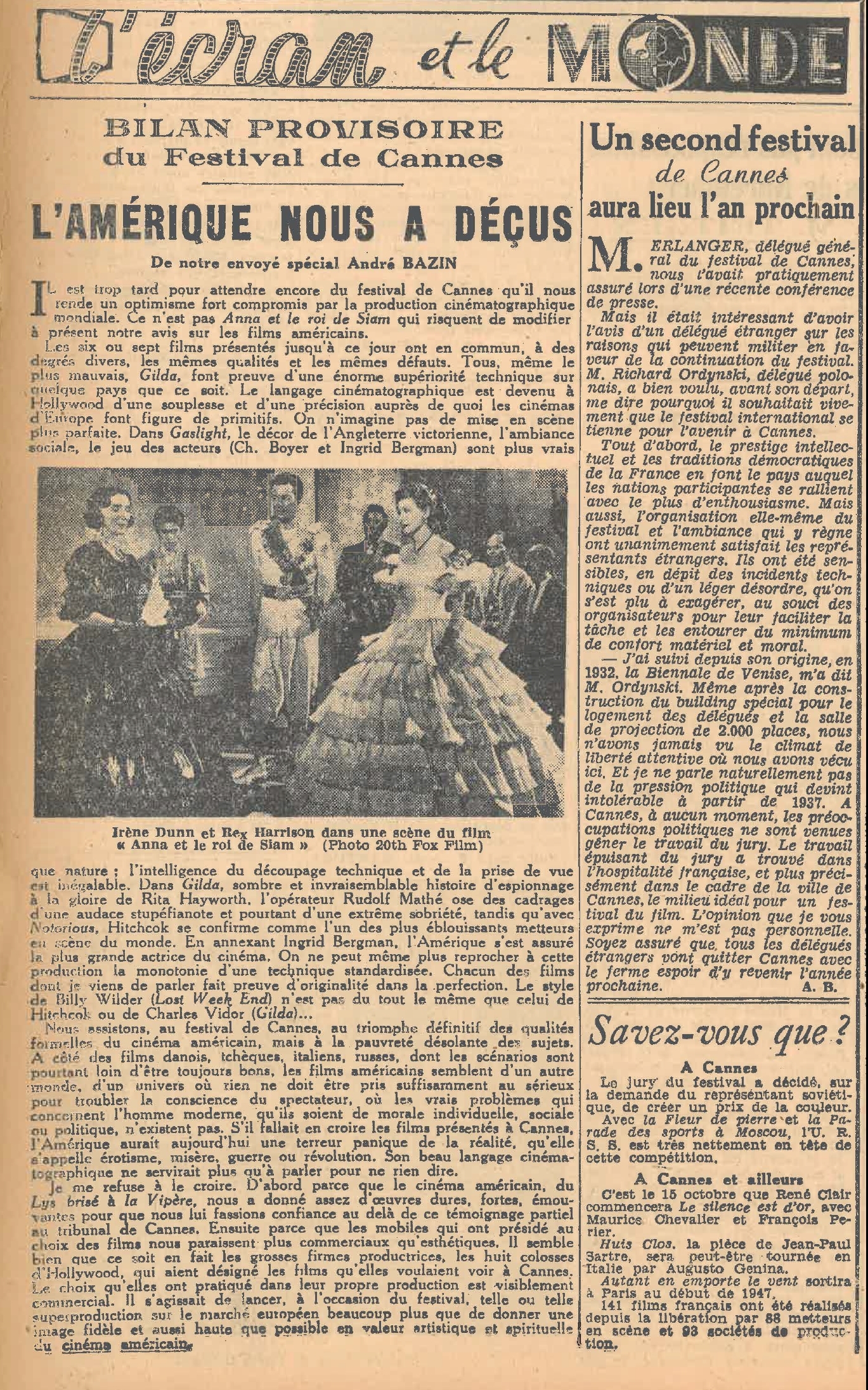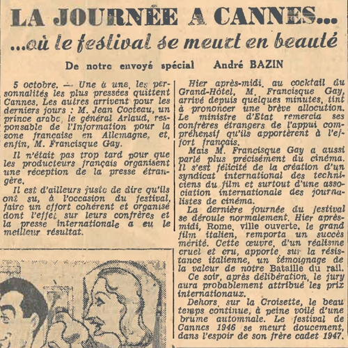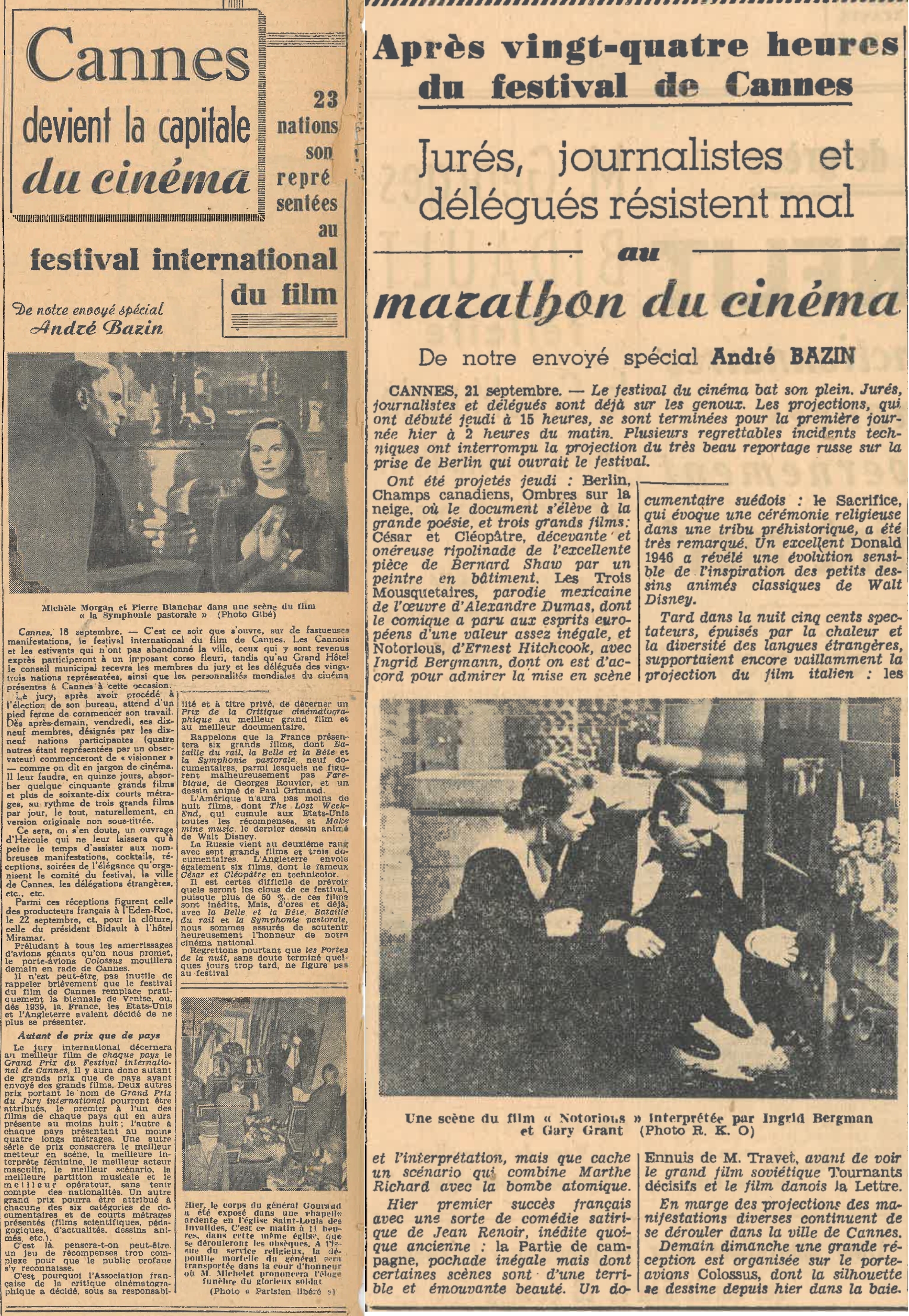 L’aventure renaît après la guerre. Le 20 septembre 1946, le Festival international du film débute. L’événement gardera ce nom jusqu’en 2002. Les projections se déroulent dans l’ancien casino de Cannes. Avec des oeuvres provenant de 18 pays, le festival est un succès.